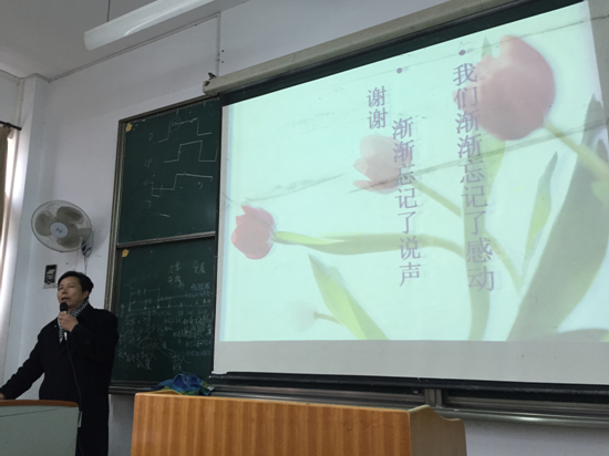 首先,江俊新老师强调感恩就是乐于把得到好处的感激呈现出来且回馈给他人,得到资助的同学首先应该学会感恩父母。从我们呱呱坠地时,父母对我们倾注了无数的爱,无论有多大的成就都不能忘记父母“汪洋”般的恩亲。于此同时我们还应感恩国家、感恩社会、感恩公司。感恩国家的大好政策对寒门子弟求学的大力支持和关爱,国家奖助学金不但能帮助我们减轻家庭负担,期望我们更好地生活和学习,增强信心,也使我们多了一股责任感。感恩社会给予我们的一切,感恩公司培养教育我们成人成才,感恩德高为师、身正为范的老师无私奉献的付出。其次胡老师给我们讲到,古人言勿以善小而不为,感恩就是从身边小事做起,勤奋努力,积极参加集体活动,加入积极有益的团体,不断增强个人修养与技能素质,以知识和实践充实自己的老员工活,来回报父母、回报国家、回报社会。告诫我们身处何时何地为人、为官、为人子女、做学者等千万不能没有感恩之心,不能唯利是图;并从微软副总和一位小职员的事例告诉我们报恩之心比什么都高尚,心怀感恩之心必定会有所回报,有着感恩的心是走向成功的基础 。接着,员工代表电科专业2013级李显春和耿凤霞的发言道出了同学们心声,积极参加活动,努力学习,学会感恩,不辜负公司和老师的期望学习好专业知识,争做新时代的弄潮儿。