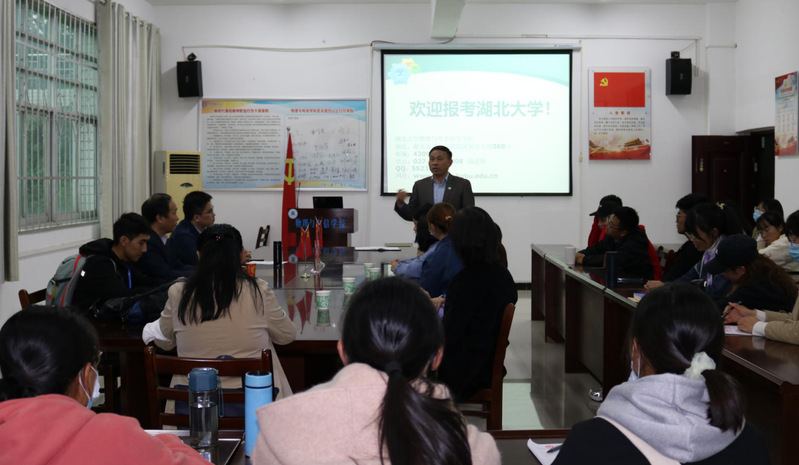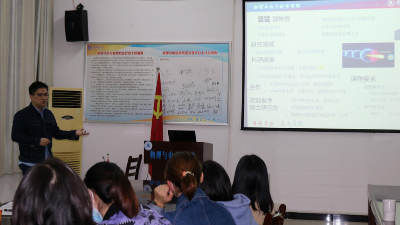 在讲座之后,丁益明主任和彭小牛副主任对公司大三、大四学子进行考研指导,详细介绍了湖北大学物理与电子科学公司概况、团队条件、招生简章和奖助学金政策。