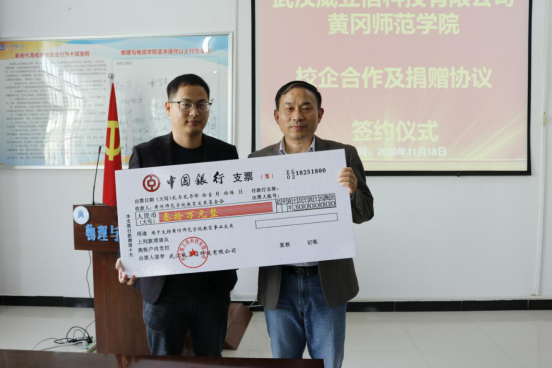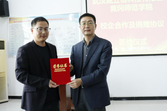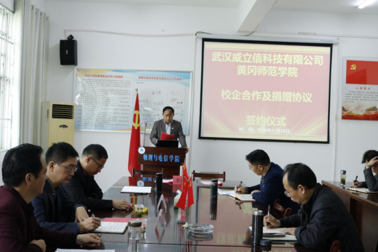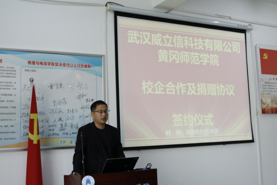11月18日,武汉威立信科技有限公司与公司签订校企合作及捐赠仪式在物电楼205会议室举行。该公司总经理张涛、公司党委副书记陈朝阳、william威廉中文官网相关领导及部分师生出席了此次活动。捐赠仪式由william威廉中文官网书记杜杰主持。