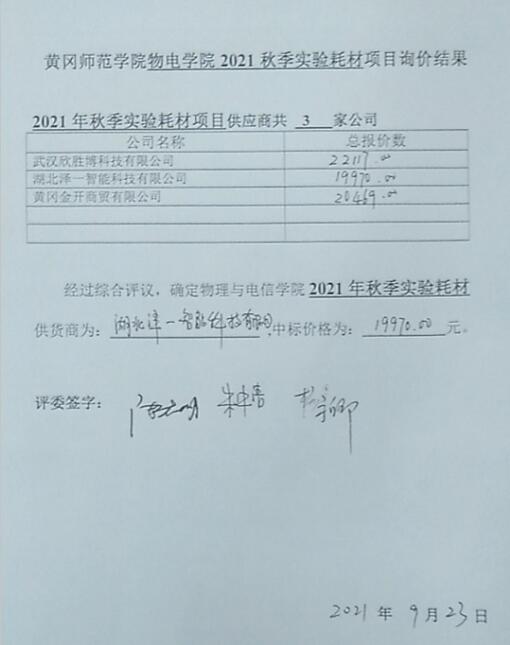william威廉中文官网william威廉中文官网2021年秋季实验耗材的采购招标工作从2021年9月10日启动,公开面向社会招标,并在公司网上公示,截止到9月18日共收到有效标书3份,于9月22日公司组织人员开标 , 开标结果为 :黄冈湖北泽一智能科技有限公司以人民币19970元的价格中标。