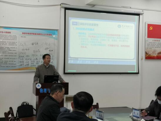 廖教授以课程评价的重要性、课程评价模型与方法、课程评价的实操三个方面展开,详细介绍了师范专业认证中课程评价的要求及作法,特别是以《高等几何》课程目标达标度的实操为例,为公司全体教师进行了深入浅出的讲解,详尽细致的分析对比,对公司范认证工作起到了指导性作用。
