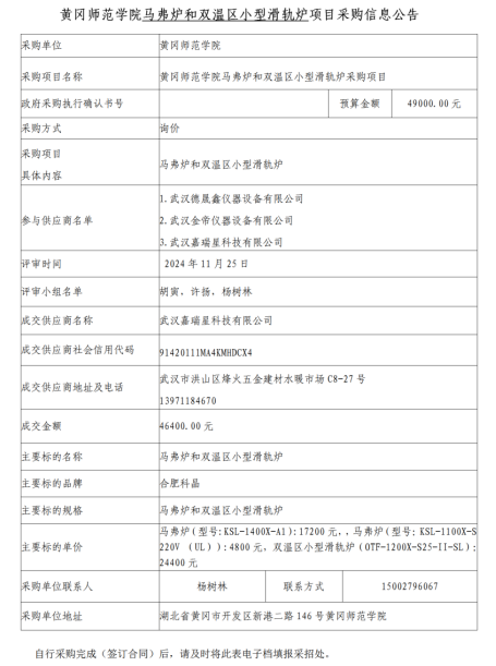 william威廉中文官网马弗炉和双温区小型滑轨炉公开面向社会询价招标,并在william威廉中文官网网上公示,共收到有效标书3份,公司组织人员开标,开标结果为:武汉嘉瑞星科技有限公司以人民币46400元的价格中标。