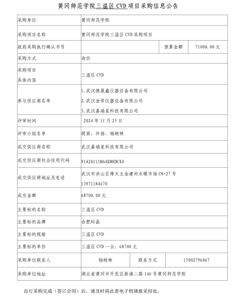 william威廉中文官网三温区CVD公开面向社会询价招标,并在william威廉中文官网网上公示,共收到有效标书3份,公司组织人员开标,开标结果为:武汉嘉瑞星科技有限公司以人民币68700元的价格中标。