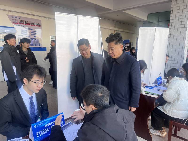 招生与就业处副处长唐文杰,公司党委书记卢年桥,计算机公司党委书记邓默耘、经理何中林及三个公司党委副书记、全体辅导员、毕业班班主任等领导老师来到招聘会现场,与毕业生和用人单位亲切交流。