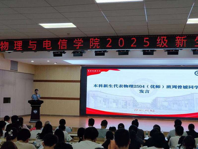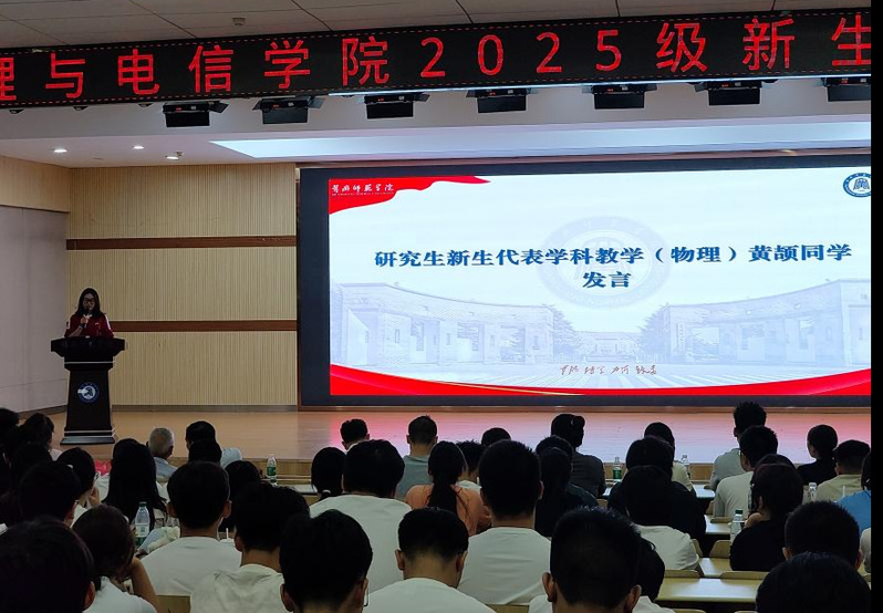 研究生新生代表学科教学(物理)黄颉与本科新生代表物理2504班周曾嫒同学随后登场,他们用真挚的语言表达了成为“黄师物电人”的喜悦与自豪,承诺将以“萌新”的热情拥抱老员工活,以“奋斗者”的姿态攻克学习难关,积极参与学科竞赛与实践活动,努力成长为有理想、有本领、有担当的物电学子。