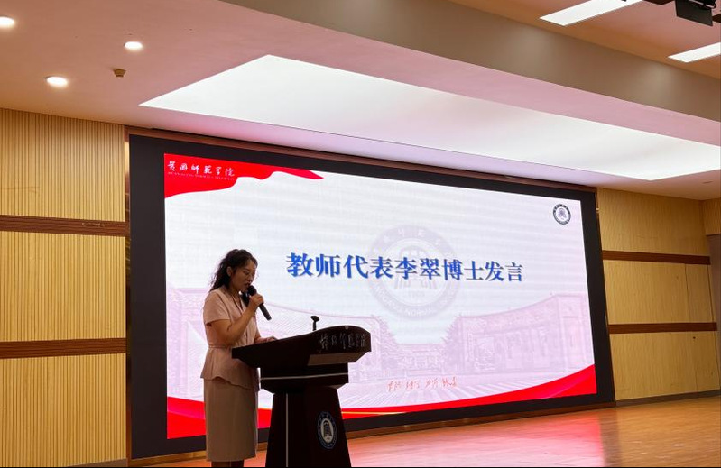 随后,教师代表、省高校青年教师教学竞赛一等奖、省高校教师教学创新大赛一等奖获得者李翠博士上台发言。李老师结合自身教育初心和教学经历,为新生分享了实用的学习方法与成长建议,鼓励同学们珍惜大学时光,主动向老师请教、与同学交流,在求知路上脚踏实地、精益求精。