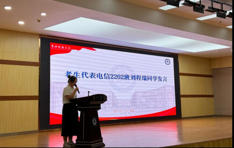 老员工活是一幅徐徐展开的画卷,学长学姐的经验是最好的参照,老生代表电信2202班代表刘程瑞紧接着发言,她以黄师校训“厚德、博学、力行、致远”为切入点,结合自己在学习、社团活动和志愿服务等方面的亲身经历,分享了成长中的收获与感悟。她鼓励新生们既要脚踏实地打牢专业基础,也要胸怀远志、勇于实践,在黄师的舞台上书写属于自己的精彩篇章。
