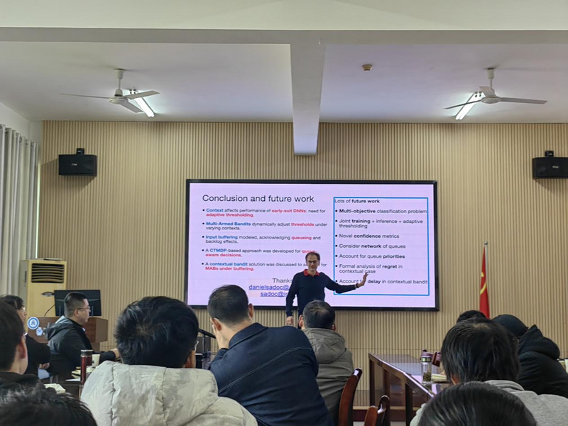 Daniel Sadoc教授公司师生带来了一场题为《早退机制神经网络:高效边缘推理的赌博机、缓冲区与系统思维》的精彩前沿报告。报告系统介绍了一项整合多项最新进展的创新研究,展示了如何将神经网络中的早退机制,从传统的静态启发式策略,演进为一种自适应、学习驱动且能感知队列状态的智能决策系统。Daniel Sadoc教授演示了在缺乏真实标签的严苛环境下,多臂赌博机模型如何动态调整退出阈值,以有效应对上下文变化、数据失真、概念漂移以及图像分类与自然语言处理等异构应用领域的多样化需求。随后,Daniel Sadoc教授将这些前沿思路与缓冲区感知控制相结合,深入论证了队列状态如何从根本上影响系统精度与延迟之间的关键权衡,并强调必须将其纳入早退策略的核心设计之中。